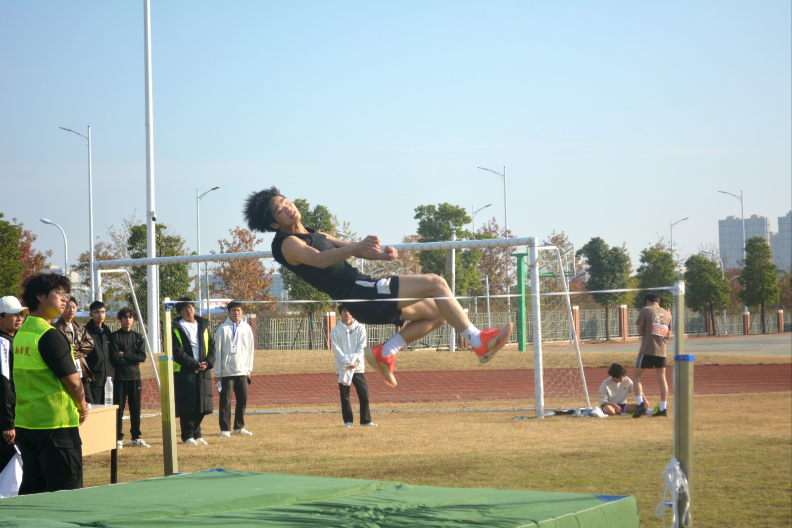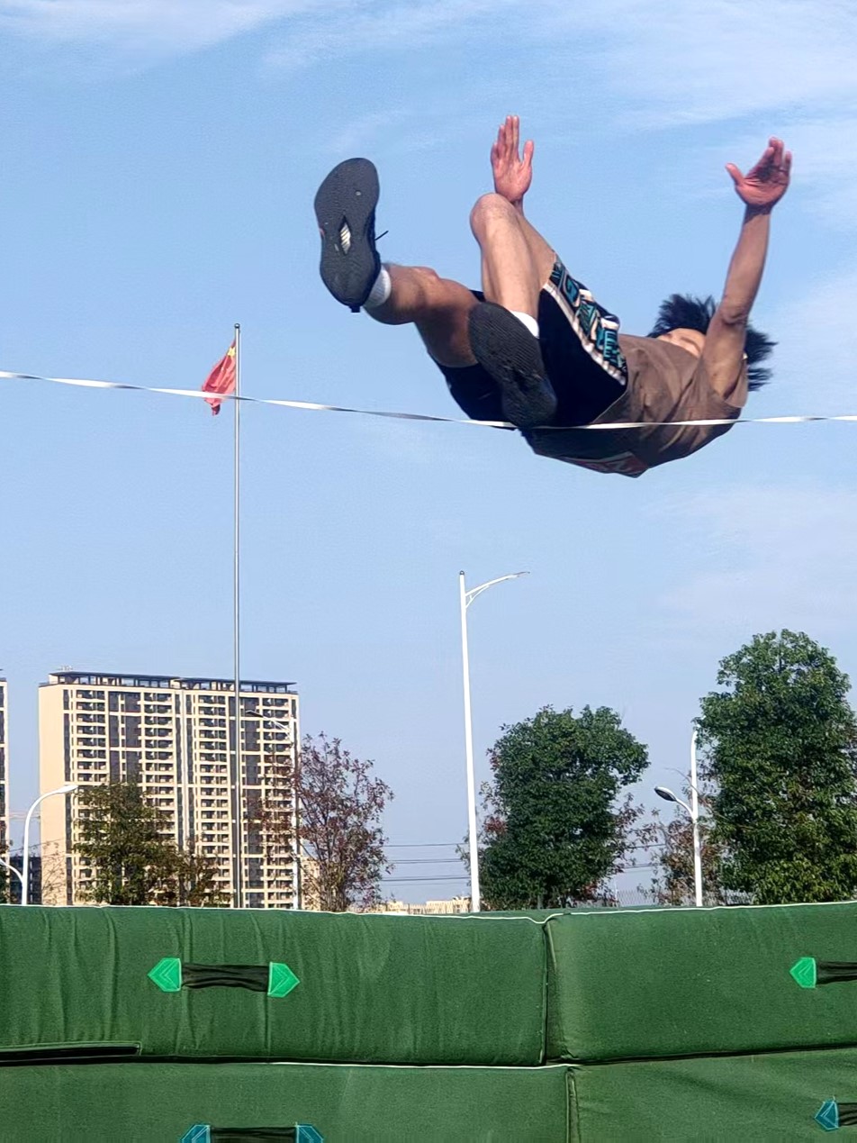 跳高运动员轻盈过杆,划出优美弧线;
