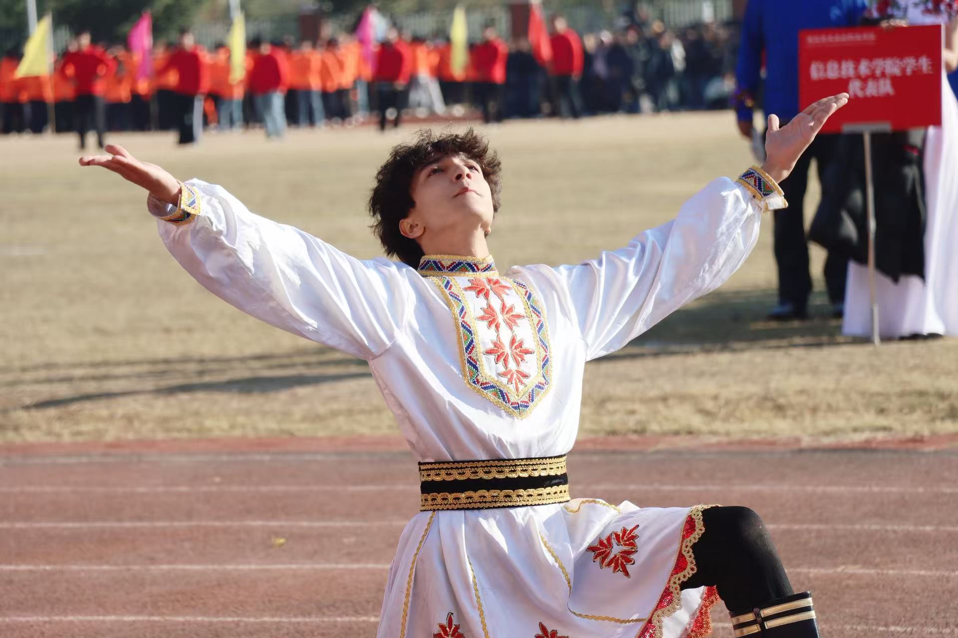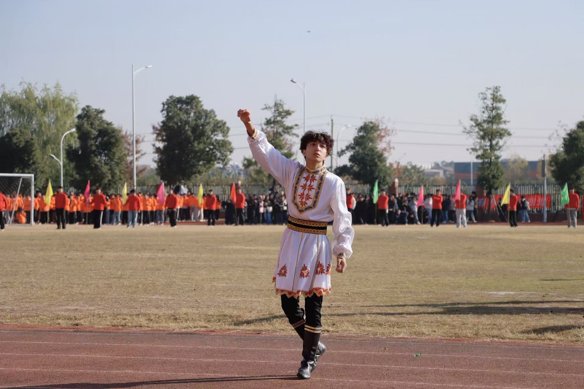 新疆学子玉散江胡加艾合买提带来了精彩绝伦的舞蹈表演。他踏着轻快的节奏,舞步飞扬,眉眼生动,如同将天山脚下的暖风与瓜果的芬芳带到了美珈的绿茵场上。美珈的“美”亦是不同民族学生“各美其美,美美与共”的生动写照。