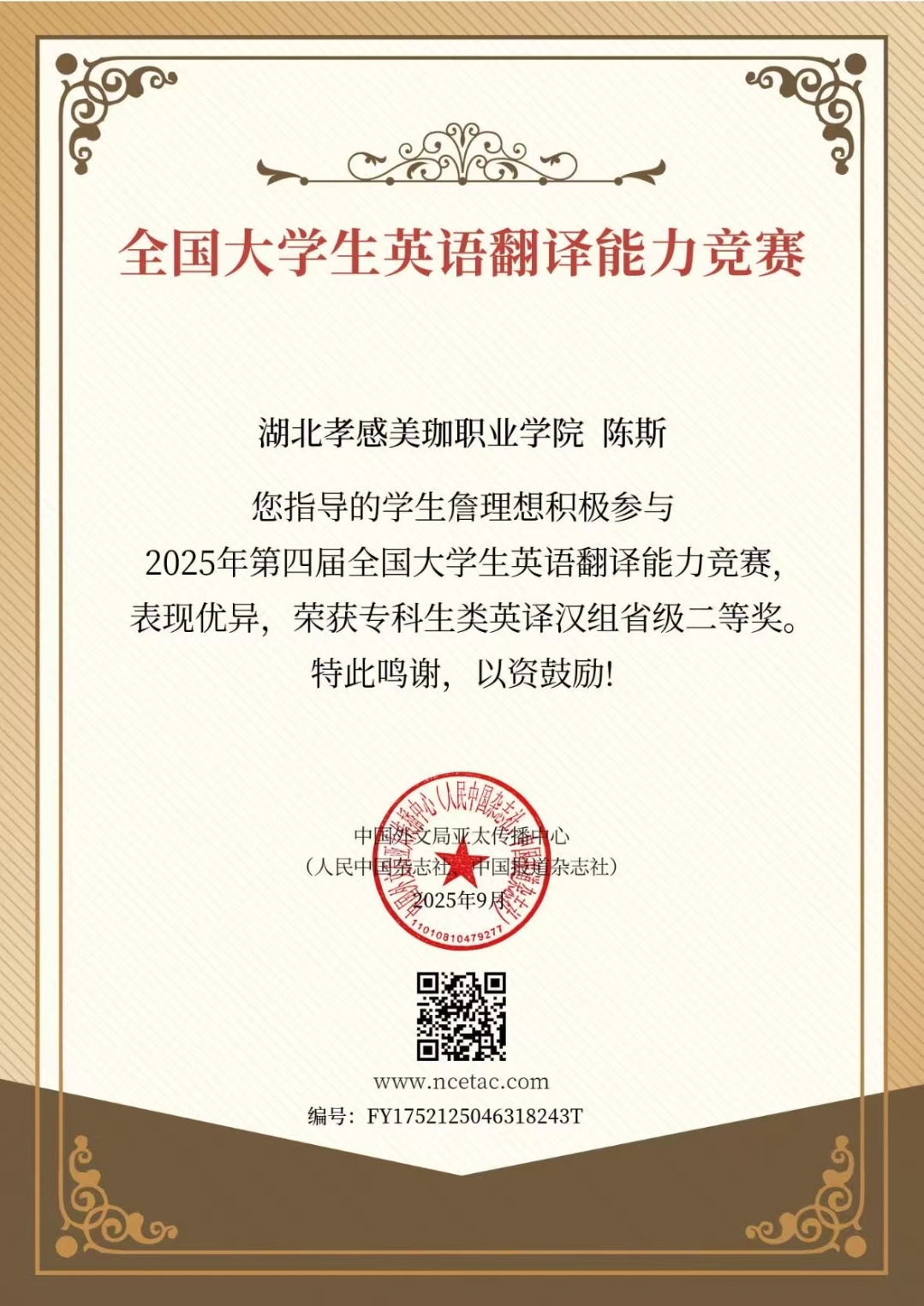 秉持学校“岗课赛融通”育人理念,陈老师化身学子英语竞赛路上的“筑梦人”,积极鼓励大家站上全国大学生翻译大赛、词汇大赛的舞台。她沉心钻研各赛事规则与评分维度,梳理竞赛核心考点与备赛技巧;课后化身专属指导师,逐字逐句点拨翻译文稿、系统梳理高频词汇,用耐心与专业为学生答疑解惑。 星光不负赶路人,在学子的勤勉奋进与陈老师的悉心护航下,这一学年硕果盈枝——大学生翻译大赛全国二等奖、省级一等奖、全国词汇大赛三等奖等荣誉接踵而至。看着学生们手捧沉甸甸的证书,脸上洋溢着自信与喜悦,陈老师满心欣慰。这份收获,既点燃了学子们的英语学习热情,更印证了“一分耕耘,一分收获”的成长真谛。