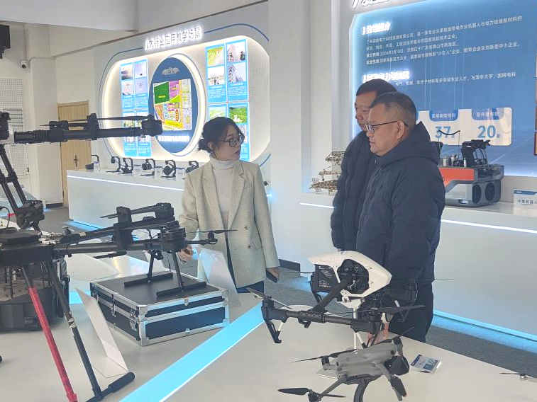 调研团队在能飞航空科技发展有限公司王总监的陪同下,深入企业运营与飞行基地一线。从展示企业发展历程的文化墙,到囊括各类工业级与特种无人机的综合展厅;从高仿真的固定翼飞机模拟操作器,到专业的检维修实训空间——团队系统考察了符合高职学生认知与技能成长的全链条教学场景。王总监详细介绍了无人机在智慧电力、智慧城市、智慧安防等十大领域的广泛应用,并展示了企业自主研发的带电绝缘涂覆无人机、喷火清障无人机、高压线除冰机器人等尖端产品,让调研组对行业前沿技术岗位和特种作业技能要求有了具象而深刻的认识。