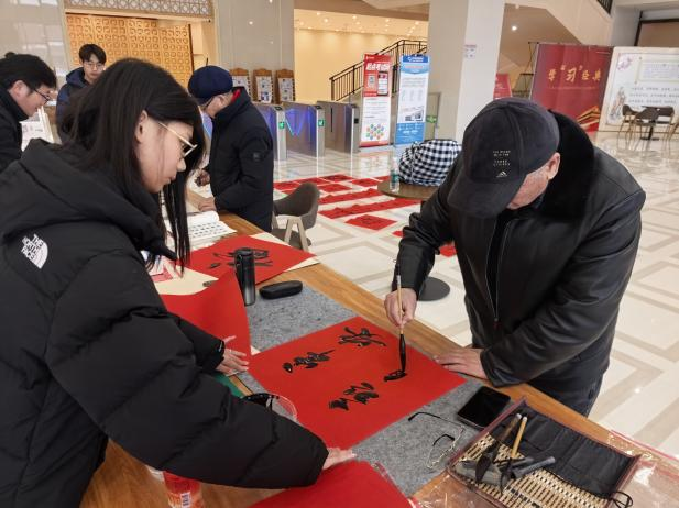 活动在图书馆大厅进行“岁末添福气,墨香迎新年”、把“福”带回家等一系列互动。活动现场,墨韵流转,笔走龙蛇。大家或驻足观摩名家挥毫泼墨,细细品味笔法间的刚柔相济;或主动上前切磋技艺,探寻尺幅之上的意境悠远;或围坐品字赏画,共话传统文化的传承之道,中华优秀传统文化的魅力在互动交流中尽情绽放。