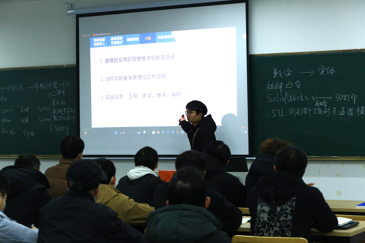 在公开课环节,江健老师以《机械产品的数字化设计》为主题,系统讲解了如何将创意构想通过数字化手段转化为实体产品的全过程。课程以3D打印技术为核心,生动展示了从虚拟设计到实物成型的完整流程。课堂上,江健老师根据以学校名称创作的图形为案例,逐步演示了三维建模、图纸绘制与打印输出的关键步骤,并引入当下受欢迎的“Labubu”文创产品为例,现场展示了通过3D打印制作的低成本、高精度模型,有效激发了学生的学习兴趣与实践热情。